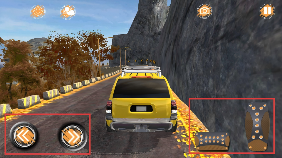 3、驾驶过程中,利用红框内的【方向控制】按钮和【油门刹车】按钮,在崎岖的山路上行驶。