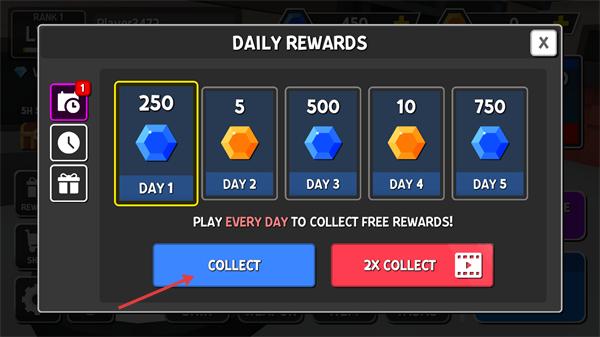 1、在【DAILY-REWARDS】界面点击【COLLECT】,领取当日奖励(如DAY-1的250钻石),每日登录可积累资源。