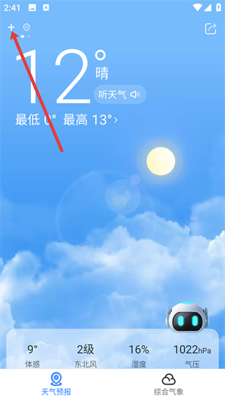1、打开即刻天气,点击左上角【+】号,进入功能入口呢。