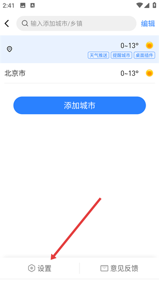 2、在该页面底部点击【设置】,进入设置界面,这里可找到天气闹钟相关选项哦。