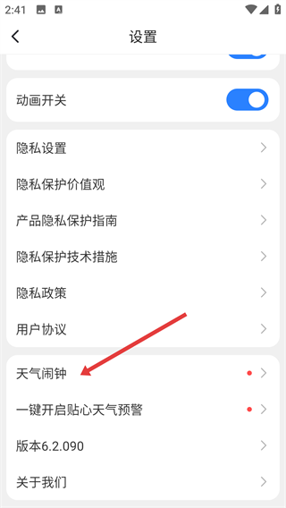 3、在设置中找到【天气闹钟】选项并点击,进入天气闹钟设置页面,准备设置提醒啦。