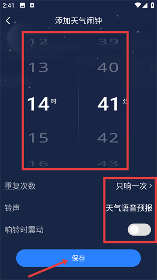 4、在添加天气闹钟页面,设置时间,选择重复次数等,最后点击【保存】即可哦。