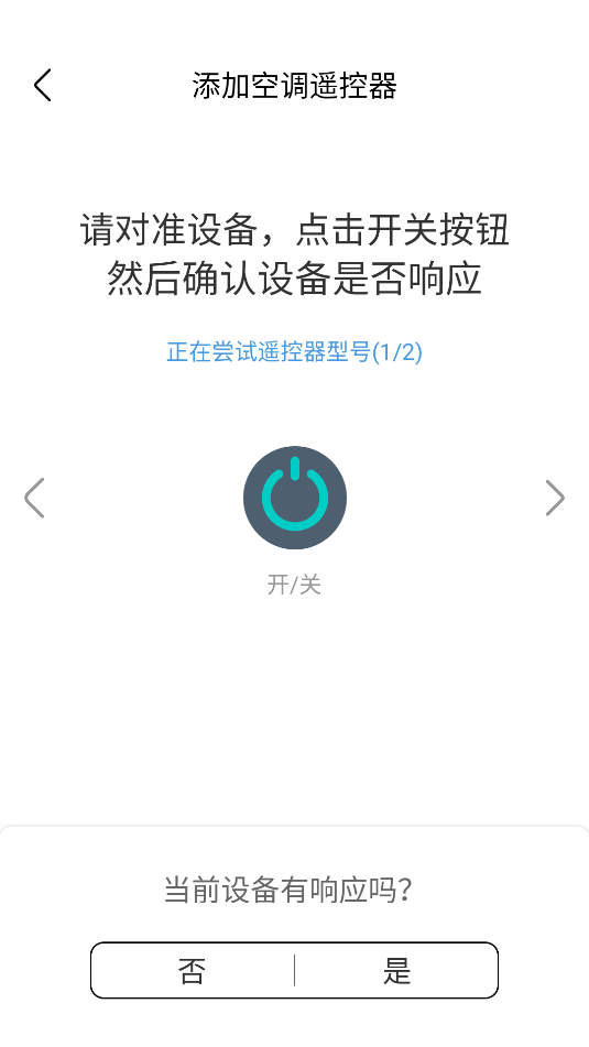 3、手机对准空调的方向,点击开/关,若空调发出启动声音,就调试好了,点击是。