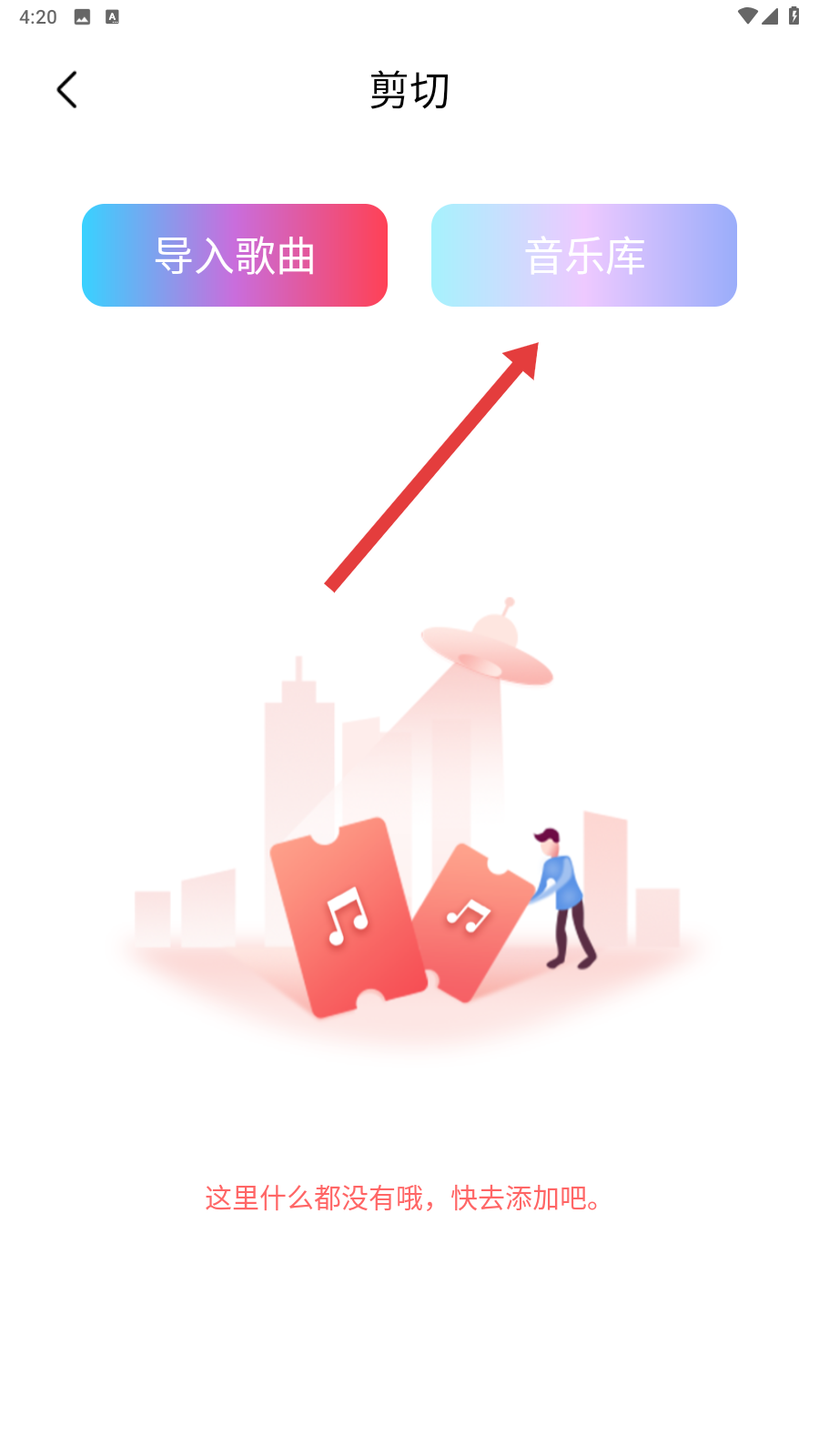 2、在剪切页面,点击【音乐库】,进入音乐选择界面,挑选想要制作成铃声的音乐哦。