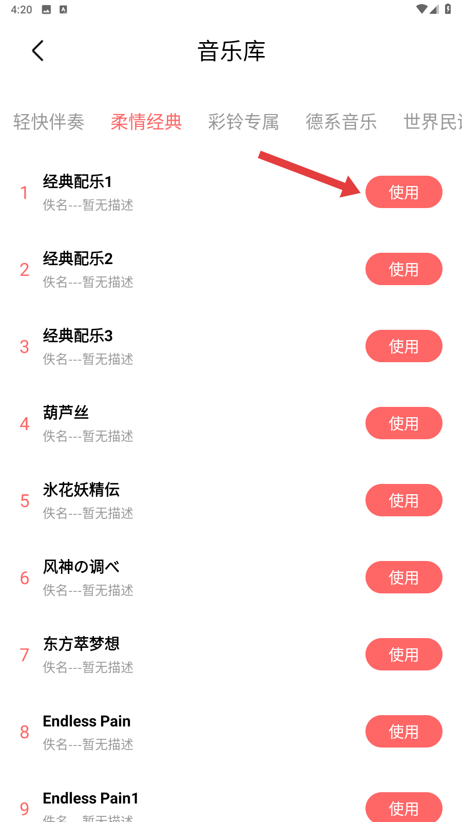 3、在音乐库中,选择心仪的配乐,点击【使用】,将其导入剪切编辑界面啦。