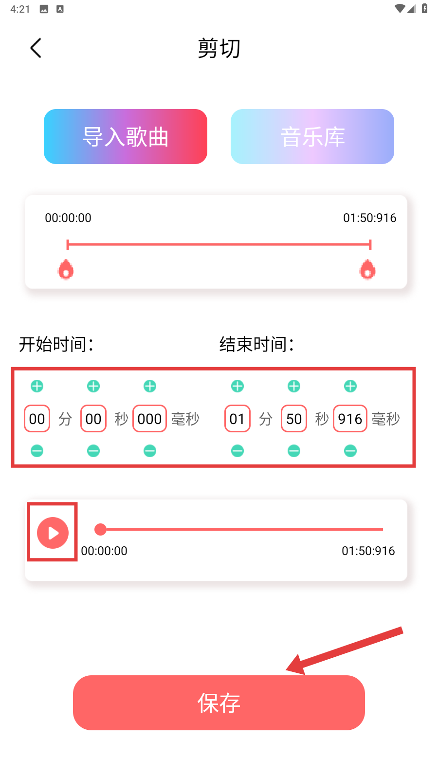 4、在剪切界面,设置好铃声的开始和结束时间,点击【保存】,就能完成铃声制作,拥有专属铃声哟。