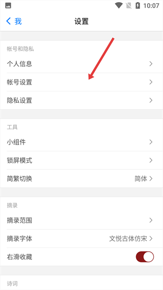 3、点击【帐号设置】,进入帐号相关设置页面。