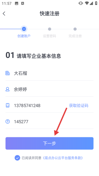 3、填好企业基本信息后,勾选同意条款,点击【下一步】进入设置密码环节。