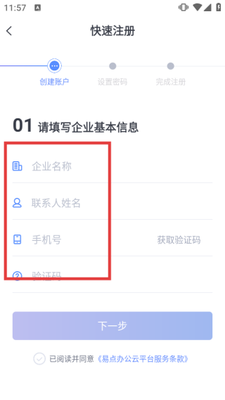 2、在快速注册创建账户步骤,填写【企业名称】【联系人姓名】【手机号】【验证码】信息。
