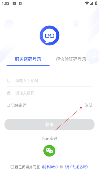 1、在登录页点击【注册】,进入用户注册流程。