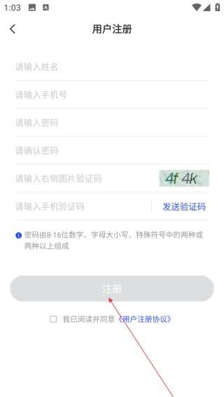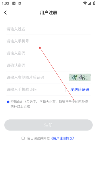2、在注册页依次填写【姓名、手机号】等信息。