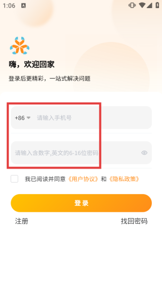 2、在账号密码登录界面,输入【手机号】和【密码】。