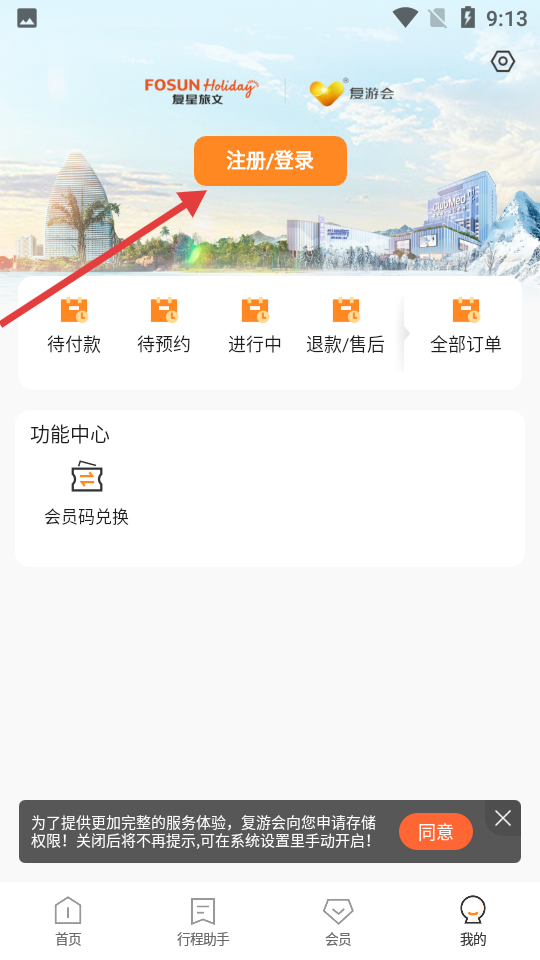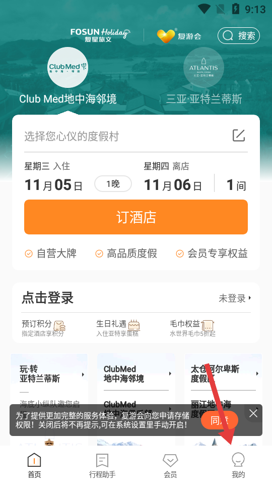 1、打开复游会App并进入首页,点击“订酒店”入口开始查找度假住宿选项。