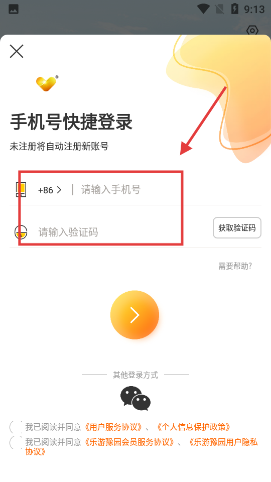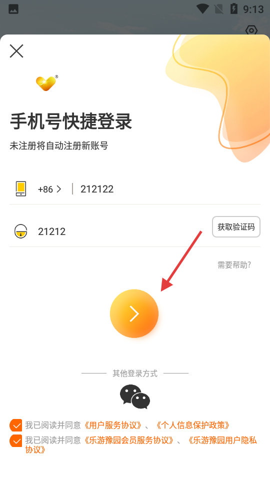 4、勾选同意相关协议后,点击橙色箭头按钮,完成登录操作。