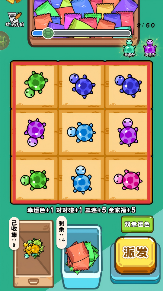3、通过收集相同颜色的乌龟卡牌,达成【幸运色+1】【对对碰+1】等组合条件来得分。