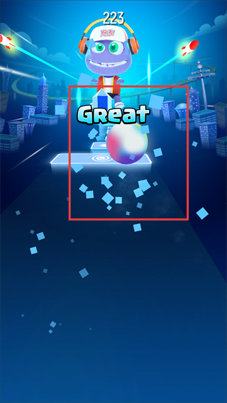 1、在角色场景中,控制彩色球体,触发【Great】反馈积累基础分数并推进游戏进程。