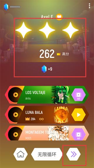 2、结算界面查看分数与奖励选择【LOSVOLTAJE】歌曲继续挑战刷新高分获取更多【宝石】奖励。