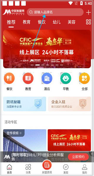 1、下载并安装全球加盟网app,启动软件后进入首页界面,用户可以按照图示箭头指示的搜索框位置,输入想要加盟的品牌名称进行搜索。