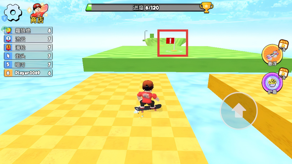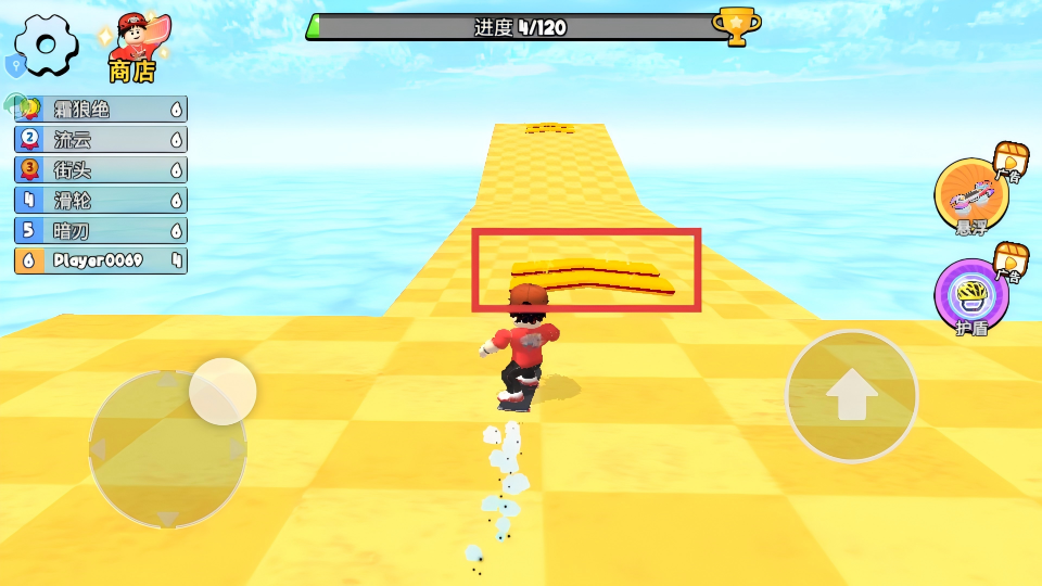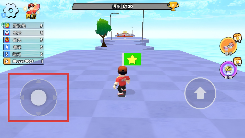 1、进入游戏后,通过操控红框内的【虚拟摇杆】来控制角色移动方向,开始滑板跑酷。