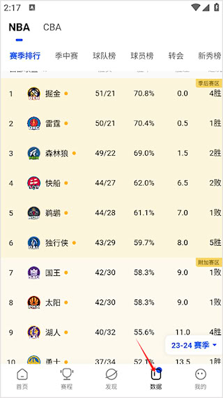 2、数据中心呈现东西部球队排行榜,涵盖球员得分、助攻、盖帽、抢断、篮板、失误等多维度数据排行。