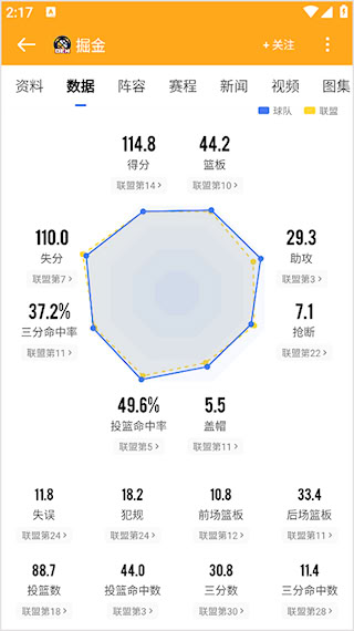 7、球队板块汇集对应球员数据及历史战绩,提供球队场均数据值等信息,助力球迷深入了解球队整体表现。