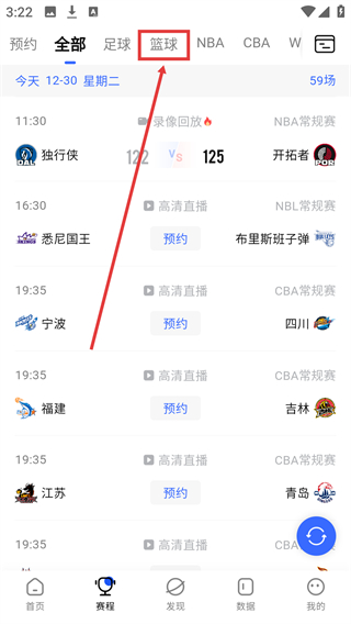 2、进入赛程页面后,找到顶部的【篮球】分类标签并点击,可筛选出篮球相关的赛事信息进行查看。