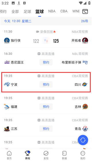 3、在篮球赛事列表中,找到【19:35-CBA常规赛-宁波vs四川】的赛事条目,点击该条目可进入详情页。