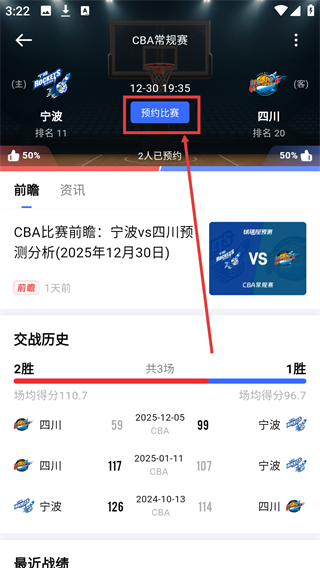 4、进入赛事详情页后,找到页面中的【预约比赛】按钮并点击,即可完成该场CBA赛事的预约操作。