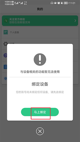 一、打开智天使 app 最新版,进入设备管理页面点击 “马上绑定”。