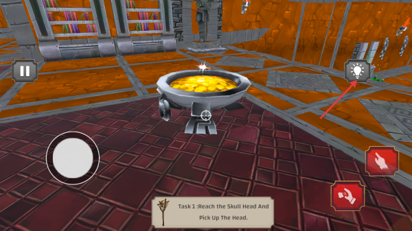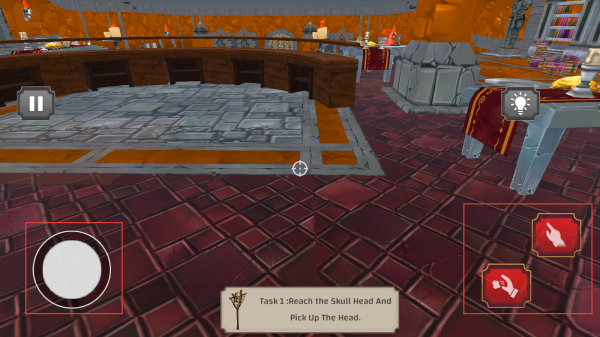 2、进入游戏场景后,利用左下角虚拟摇杆控制角色移动,右下角按键进行交互等操作,按任务提示推进游戏。