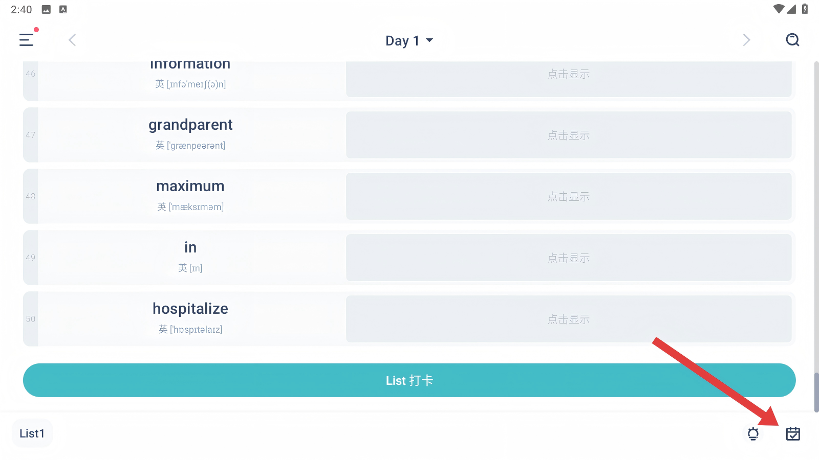 1、在单词列表里,我们点击右下方按键,准备更换词书啦。