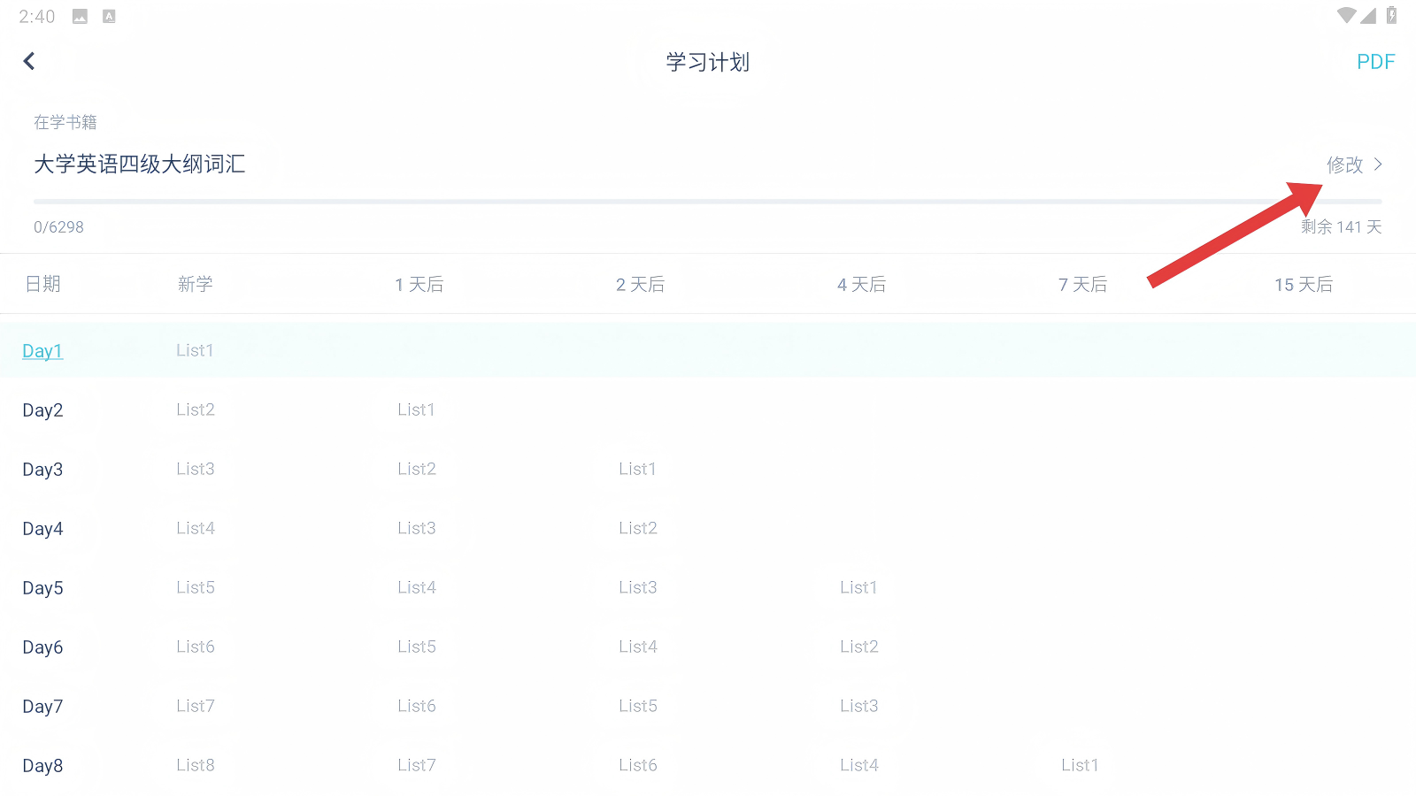 2、在【学习计划】界面,我们接着点击【修改】按键,进入下一步骤呢。