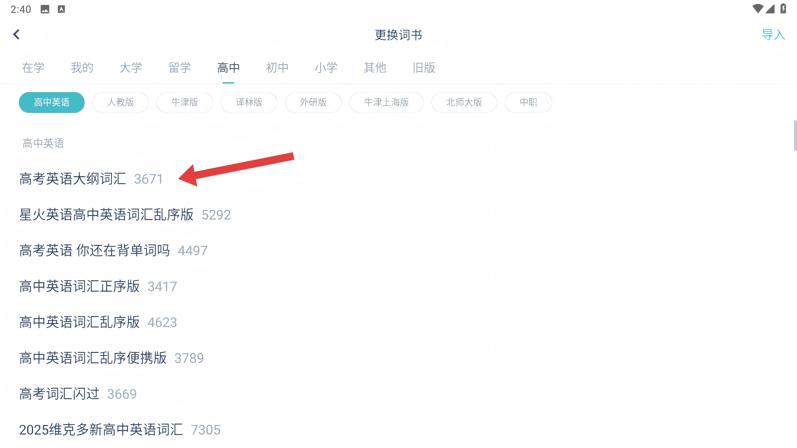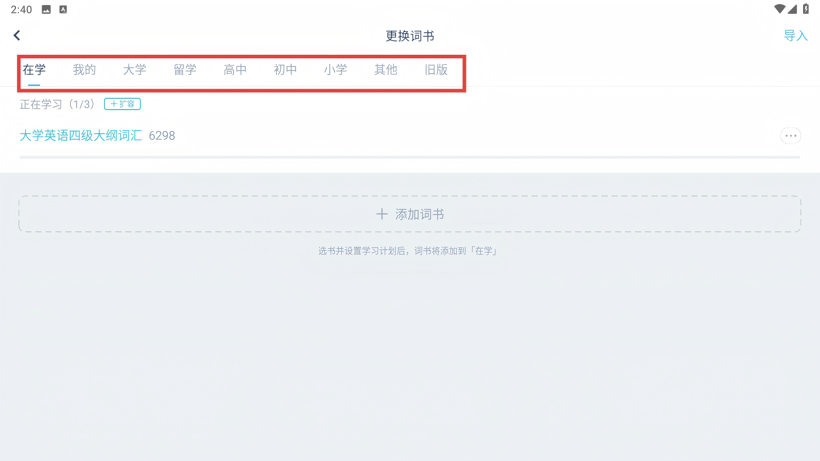 3、更换词书时,可在顶部【在学】、【我的】等分类标签中选择对应学段,快速定位想学习的词书类别呢。