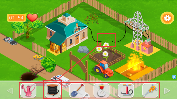 4、拖动下方工具到场景中进行整治,例如拖动线圈将断掉的电线进行修缮,但要注意精准使用工具,不然会重新开始。