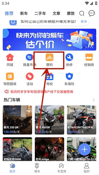 3、登录后的主页面会展示同城动态、闲置物品、热门车型等资讯。