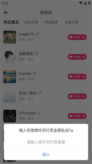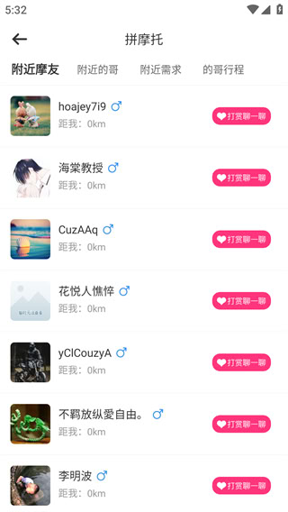 2、页面将展示周边的摩友、骑手,以及相关需求和骑手行程。