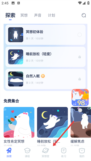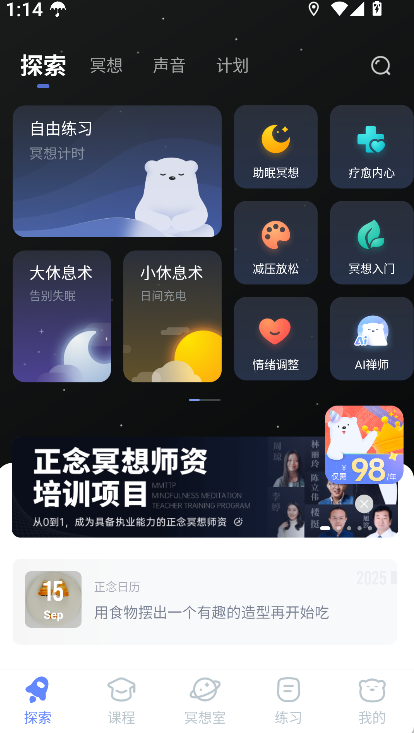1、自由练习模式灵活度高,进入探索页面即可选择合适的方式进行冥想,能够适配多种场景,满足不同状态下的放松需求。