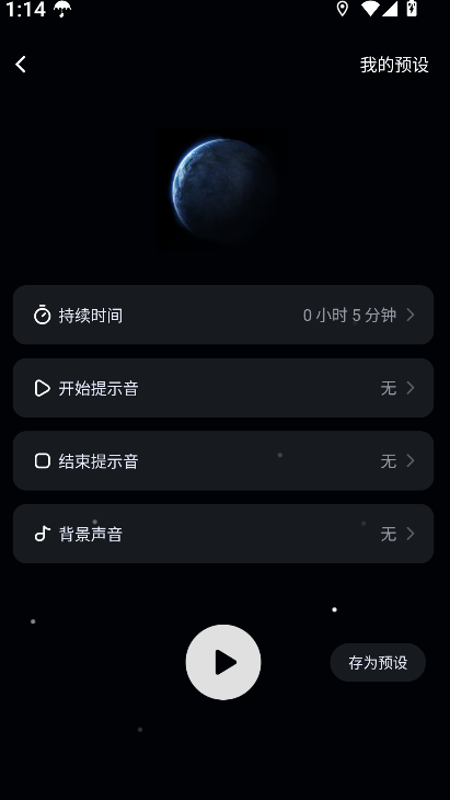 2、在练习开始前,可手动设置时长,点击播放按钮后进入冥想流程。