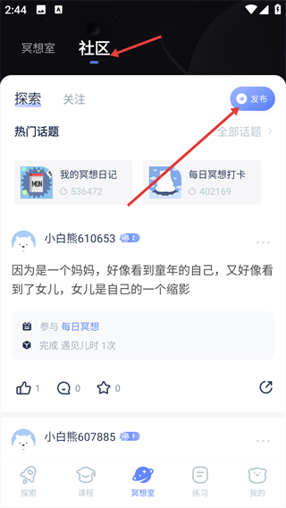 2、选择“社区”标签,点击右上角的“发布”按钮,进入动态编辑页面。