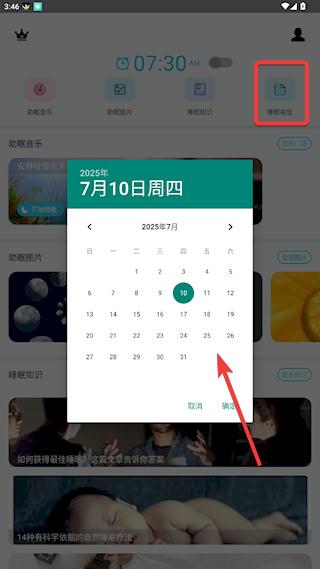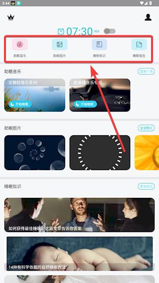 1、进入首页,可以看到【助眠音乐】【助眠图片】【睡眠知识】【睡眠报告】