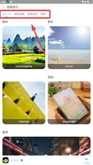 2、点击【助眠音乐】,可以看到【自然之声】【睡前故事】【晚安音乐】【冥想】
