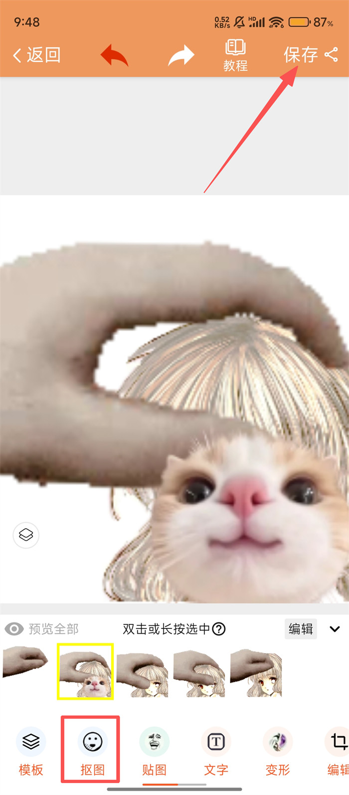4、任意选择图片会自动抠图,再用其他功能调整图片,编辑完成后点击右上角【保存】,就能把制作的趣味图片保存到相册啦。