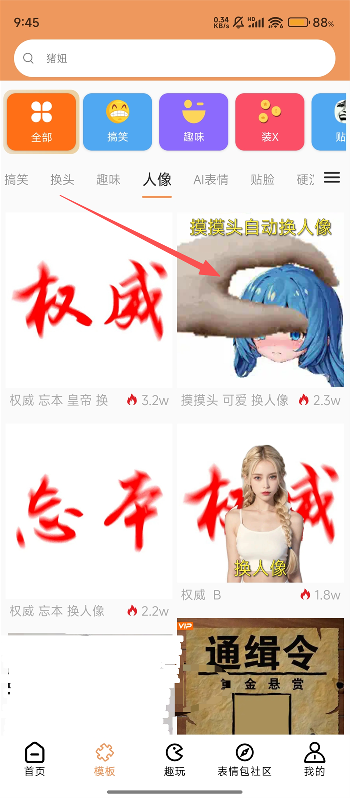 2、在模板界面,我们可以切换到【人像】分类,这里有多种换人像模板,挑选喜欢的模板点击即可呢。