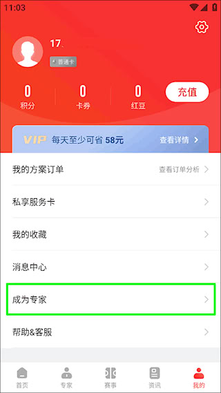 1、开启应用,于“我的”界面定位并点击“成为专家”选项。