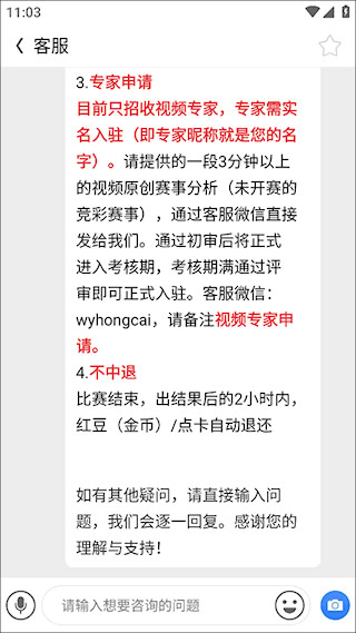 5、充值成功后红豆未到账怎么办?首先确认充值时是否未登录,若未登录,退出账号后到“我的余额”查看;苹果支付服务器波动时,半小时未到账先退出APP,重新打开查看,仍未到账可添加客服微信:wyhongcai;网络问题可能导致红豆延迟半小时到账,建议耐心等待;可重启APP查看红豆是否到账;若以上方法无效,可添加客服微信;特殊节假日无法联系客服时,登录APP在“我的”栏目提交“意见反馈”。