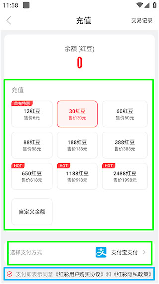 2、充值面板展开后,设定充值额度,选定支付渠道,勾选同意相关协议,触动“立即支付”。