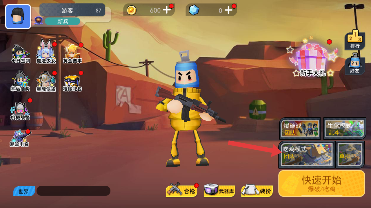 1、主界面选【吃鸡模式团队】,进入团队竞技玩法,匹配队友对战。