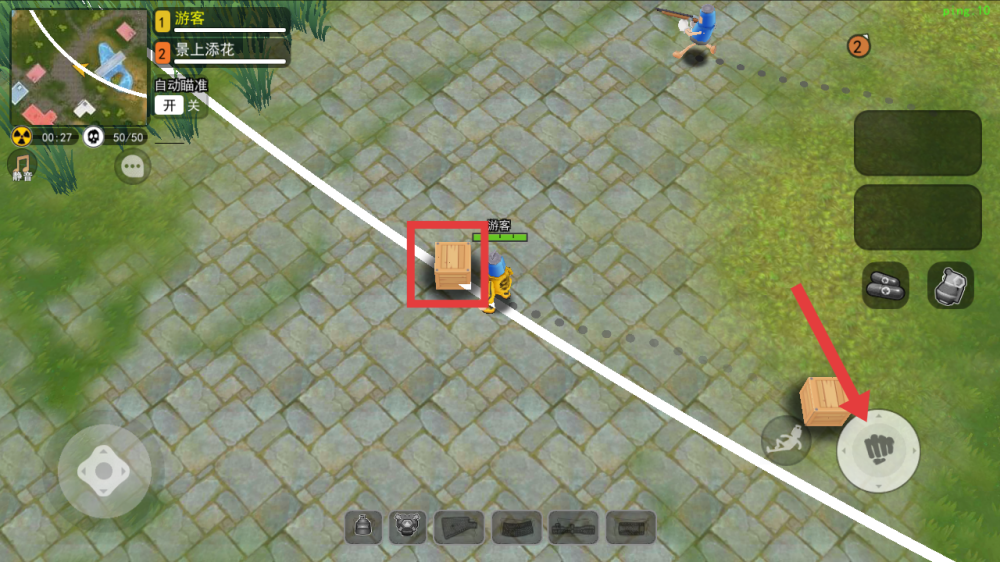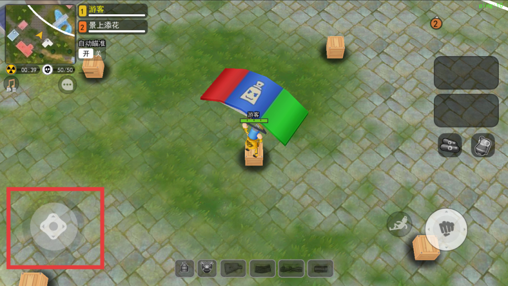 3、玩家降落到地点后,移动至木箱(红框)位置,点右侧攻击键(拳头图标),打破箱子捡物资(武器、配件)。