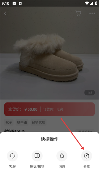 3、打开快捷操作菜单,找到并选择【分享】功能。
