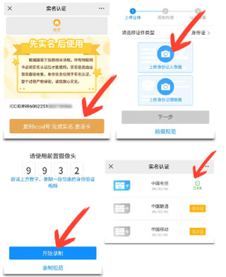 - 电信实名认证:复制ICCID号,上传证件,进行活体检测。